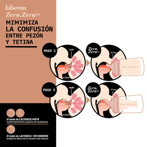 Beneficios del Biberón ZERØ.ZERØ™: El biberón ZERØ.ZERØ™ con bolsa anticólico funciona de manera similar a las glándulas mamarias, eliminando burbujas para evitar la ingesta de aire y ayudando a reducir los cólicos gaseosos del bebé.